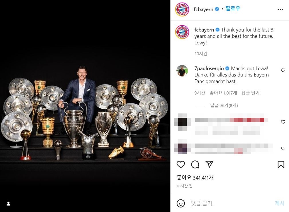 뮌헨 구단은 사회관계망서비스(SNS)에 레반도프스키가 자신이 들어 올린 우승 트로피들 사이에 앉아 있는 사진과 함께 "지난 8년 동안 고마웠고, 앞으로도 행운을 빈다"는 글을 올렸다.