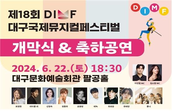 ㈔대구국제뮤지컬페스티벌은 22일 오후 6시 30분 대구문화예술회관 팔공홀에서 DIMF 개막식 및 축하공연을 한다. 당초 달서구 코오롱야외음악당에서 행사를 열 계획이었으나 비 예보를 고려해 이같이 장소를 변경했다.
