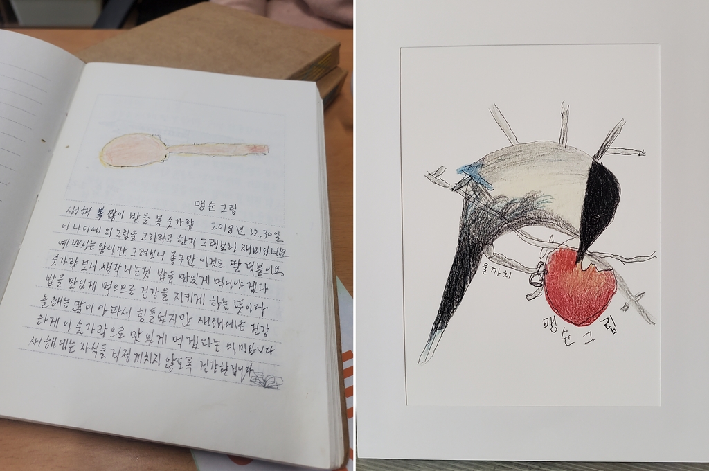 ▲ 맹순 씨가 2018년 처음 그린 숟가락(왼쪽)과 최근 그린 물까치(오른쪽) [류수현 기자 촬영]