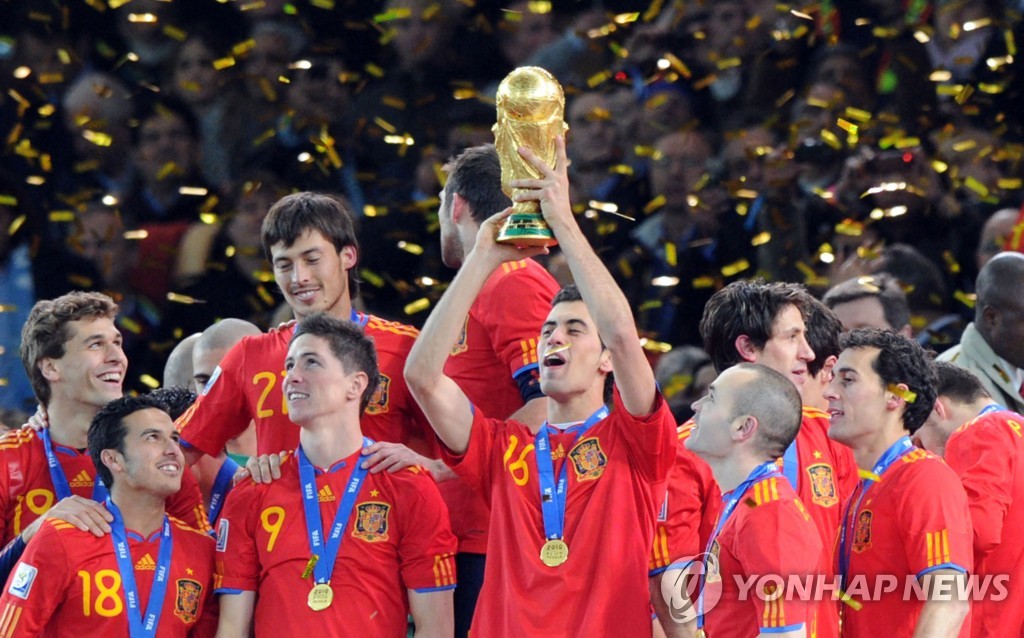 | ▲ 2010년 남아프리카공화국 월드컵에서 우승 트로피를 들어올리던 스페인 부스케츠. [AFP=연합뉴스 자료사진] |