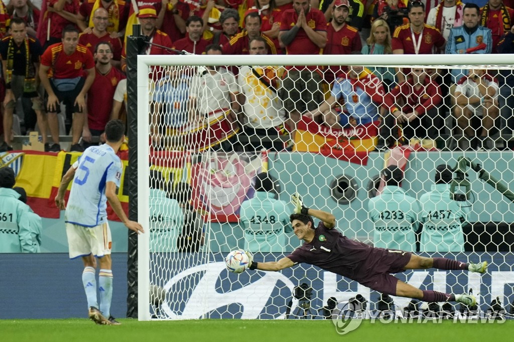 | ▲ 모로코전 승부차기 실축하는 스페인 부스케츠 (알라이얀 AP=연합뉴스) 6일(현지시간) 카타르 알라이얀의 에듀케이션 시티 스타디움에서 열린 2022 카타르 월드컵 16강 스페인 대 모로코 경기의 승부차기에서 스페인 주장 세르히오 부스케츠(34·FC바르셀로나)의 슈팅이 모로코 골키퍼 야신 부누에게 막히고 있다. 이날 부스케츠는 스페인의 세 번째 키커로 나왔다. 2010년 남아공 월드컵부터 스페인 무적함대의 전성기 주역이었던 부스케츠는 2연속 월드컵 8강 진출에 실패했다. 2022.12.07 jason3669@yna.co.kr |