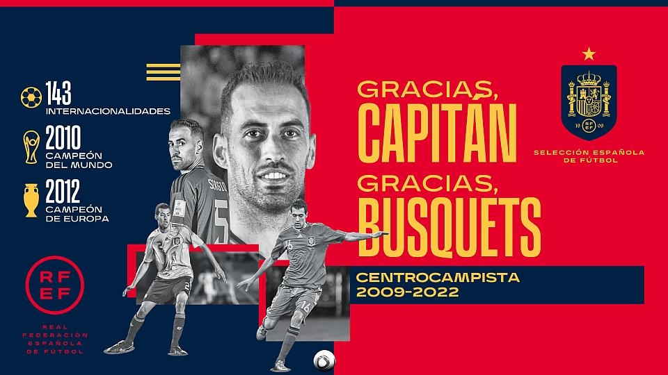 스페인 대표팀 주장 부스케츠는 16일(현지시간) 자신의 사회관계망서비스(SNS)를 통해 "약 15년 동안 143경기(2골)를 뛴 끝에 국가대표팀과 작별할 때가 왔음을 알린다"라고 은퇴 결심을 밝혔다.