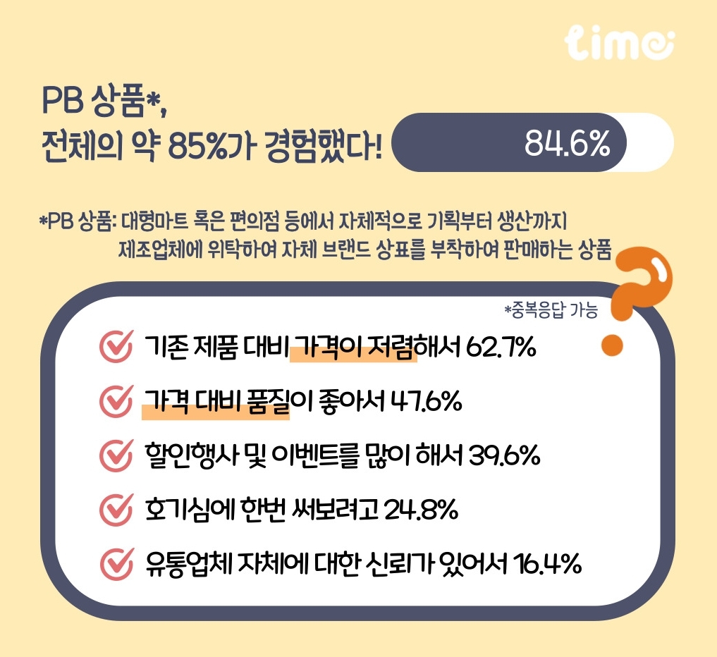 롯데멤버스는 4∼5일 리서치 플랫폼 라임에 의뢰해 전국 20∼50대 성인 2천명에게 PB상품 구매경험 설문조사를 진행한 결과 응답자의 84.6%가 PB상품을 구입해본 것으로 나타났다고 14일 밝혔다.