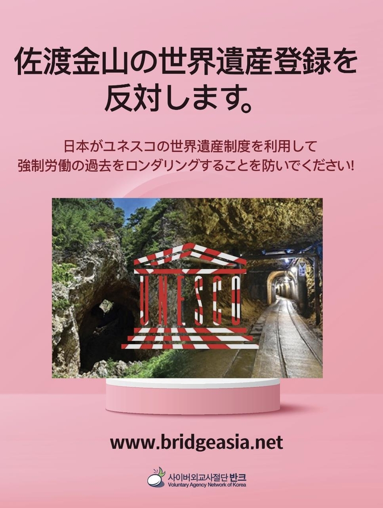 (서울=연합뉴스) 왕길환 기자 = 일본 정부가 니가타(新潟)현의 '사도시마노킨잔'(佐渡島の金山·사도광산)을 유네스코 세계문화유산으로 등재하려는 데 대해 사이버 외교 사절단 반크는 "이를 막아달라"고 일본인들에게 호소하는 포스터를 제작해 10일 소셜미디어(SNS)에서 배포했다.