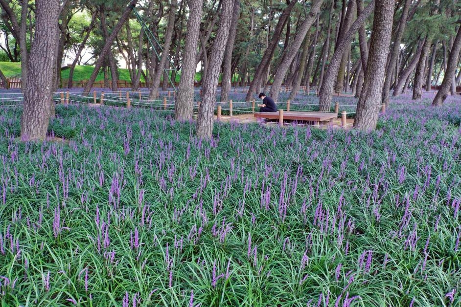 그늘에서도 잘 자라는 맥문동은 1년 만에 꽃을 활짝 피워 소나무 숲을 찾는 시민들에게 색다른 정취를 선사한다.