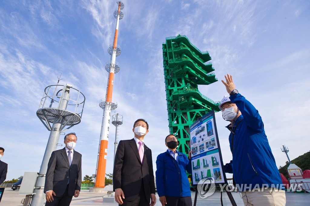 | ▲ 누리호 발사 앞서 나로우주센터 찾은 이종호 장관 (서울=연합뉴스) 이종호 과학기술정보통신부 장관이 지난달 26일 오후 전라남도 고흥군 나로우주센터를 방문해 발사대 준비 현황을 점검하고 있다. 왼쪽부터 이상률 한국항공우주연구원장, 이종호 과학기술정보통신부 장관, 고정환 한국형발사체개발사업본부장. 2022.5.26 [과학기술정보통신부 제공. 재판매 및 DB금지] photo@yna.co.kr |