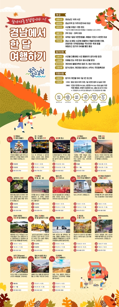 시·군별 상세 모집 일정과 여행 기간은 경남관광길잡이 누리집(http://tour.gyeongnam.go.kr) 또는 각 시·군 관광누리집에서 확인할 수 있다.