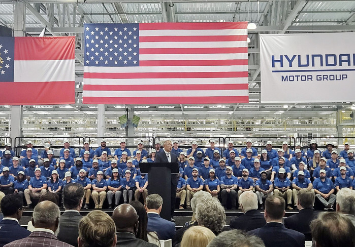 Hyundai Motor Group Executive Chairman Euisun Chung (C) speaks during a ceremony in Ellaville, the U.S. state of Georgia, on March 26, 2025, to open the South Korean carmaker's first dedicated EV factory, Hyundai Motor Group Metaplant America. (Yonhap)