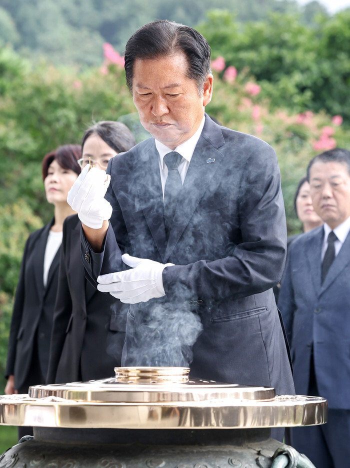 Jung Chung-rae, new leader of the ruling Democratic Party, burns incense to pay tribute to South Korean patriotic martyrs and war dead at the National Cemetery in Seoul on Aug. 4, 2025. (Pool photo) (Yonhap)