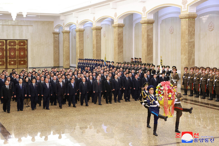 North Korean government and party officials visit the Kumsusan Palace of the Sun in Pyongyang on Jan. 1, 2025, to pay tribute to North Korea's founder, Kim Il-sung, and his son, Kim Jong-il, to mark New Year's Day, in this photo released by the North's official Korean Central News Agency the next day. The mausoleum enshrines the mummified bodies of Kim Il-sung and Kim Jong-il. (For Use Only in the Republic of Korea. No Redistribution) (Yonhap)