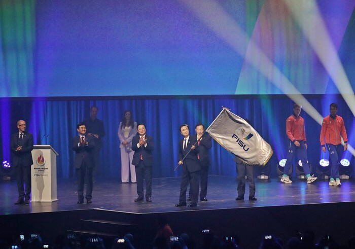 Kim Tae-heum (C), governor of South Korea's South Chungcheong Province, waves the International University Sports Federation (FISU) flag at the closing ceremony for the Rhine-Ruhr FISU World University Games in Duisburg, Germany, on July 28, 2025. The Korean central region of Chungcheong, covering the cities of Daejeon and Sejong, and the two central provinces, South and North Chungcheong, was named the host of the 2027 Summer World University Games in 2022, bringing the biennial event to the country for the fourth time. (Yonhap)