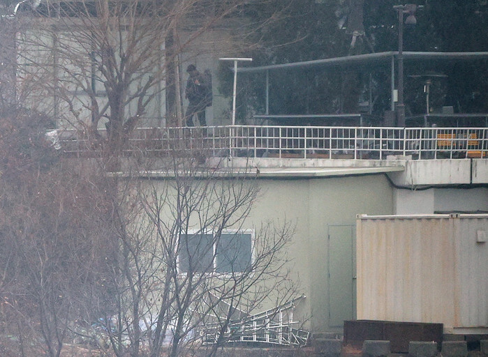 A person believed to be a security guard patrols at impeached President Yoon Suk Yeol's official residence in Seoul on Jan. 13, 2025, one week after a court issued a second warrant to detain Yoon in connection to his short-lived imposition of martial law. (Yonhap)