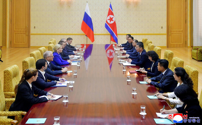 North Korean Culture Minister Sung Jong-gyu (4th from R) and Russian Culture Minister Olga Lyubimova (4th from L) hold talks at the Mansudae Assembly Hall in Pyongyang on June 29, 2025, to sign a pact on cooperation in culture for the 2025-27 period, in this photo released by the North's official Korean Central News Agency the next day. A delegation of the Russian culture ministry, led by Lyubimova, visited the North Korean capital to mark the first anniversary of the establishment of the treaty on a comprehensive strategic partnership between the two countries. (For Use Only in the Republic of Korea. No Redistribution) (Yonhap)