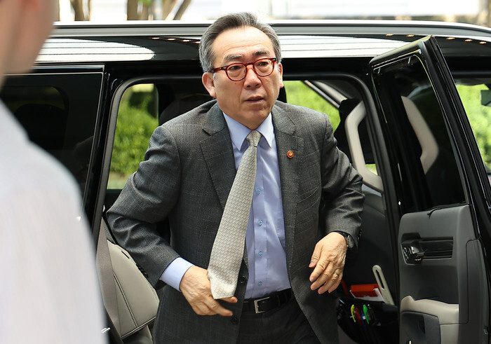 Foreign Minister Cho Tae-yul arrives at a hotel in Seoul on Sept. 4, 2024, to attend the second annual Trilateral Economic Dialogue, which includes private and public sector leaders from South Korea, the United States and Japan. (Yonhap)