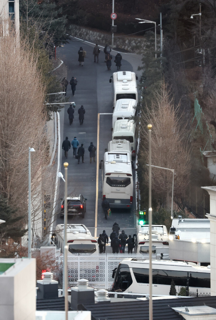 People believed to be security guards walk near the entrance of impeached President Yoon Suk Yeol's official residence in Seoul on Jan. 10, 2025, as investigators led by the Corruption Investigation Office for High-ranking Officials are expected to execute a second warrant to detain Yoon in connection to his short-lived imposition of martial law. (Yonhap)