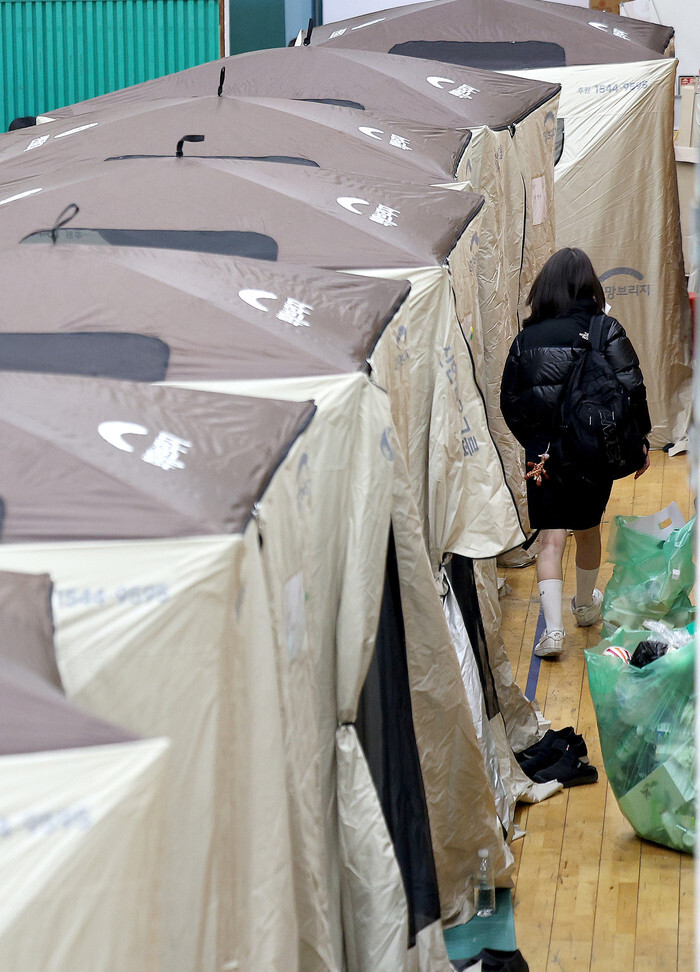 A student exits a tent at a gymnasium used as a shelter in Uiseong, North Gyeongsang Province, southeastern South Korea, on March 24, 2025, following a wildfire on March 22. (Yonhap)