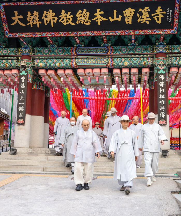 Buddhist monks of Jogye Temple affiliated with the Jogye Order, South Korea's largest Buddhist sect, leave the temple in Seoul's Jongno Ward on May 29, 2025, for a polling station to cast early votes for the June 3 presidential election. (Yonhap)