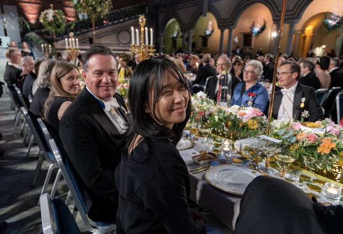South Korean novelist Han Kang (L, front) , winner of the Nobel Prize in literature, poses for a photo at the Nobel Prize banquet in the City Hall in Stockholm, Sweden, on Dec. 10, 2024. (Yonhap)