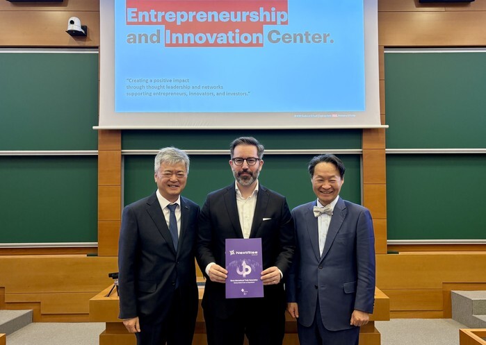 Lee In-ho (L), executive vice chairman of the Korea International Trade Association (KITA), poses for a photo with Josemaria Siota (C), executive director of IESE Business School's Entrepreneurship and Innovation Center, during their meeting in Barcelona on March 4, 2025, in this photo released by KITA. (PHOTO NOT FOR SALE) (Yonhap)