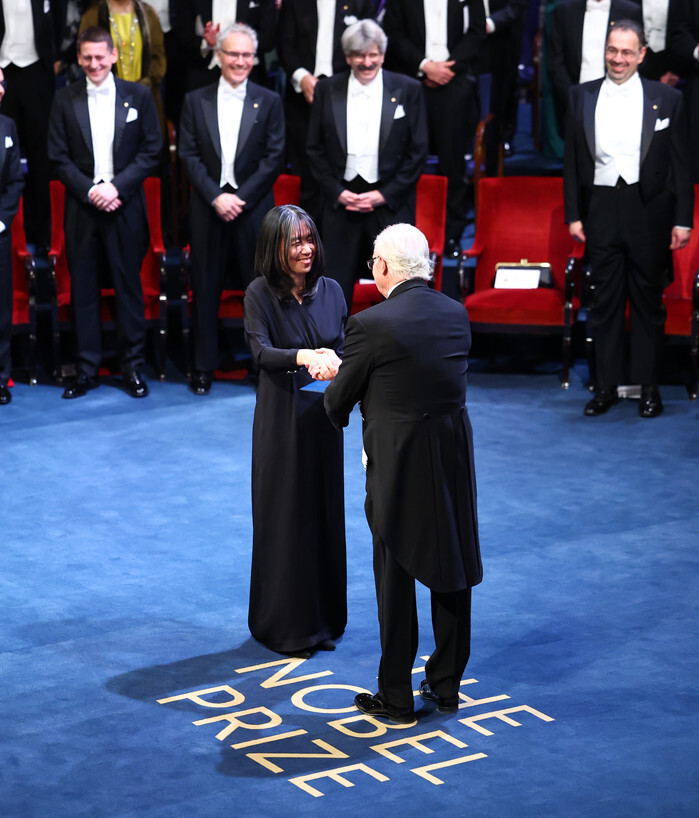 South Korean novelist Han Kang (L) receives a diploma and Nobel medal from Sweden's King Carl XVI Gustaf during the Nobel Prize 2024 award ceremony at the Concert Hall in Stockholm, Sweden, on Dec. 10, 2024. (Yonhap)