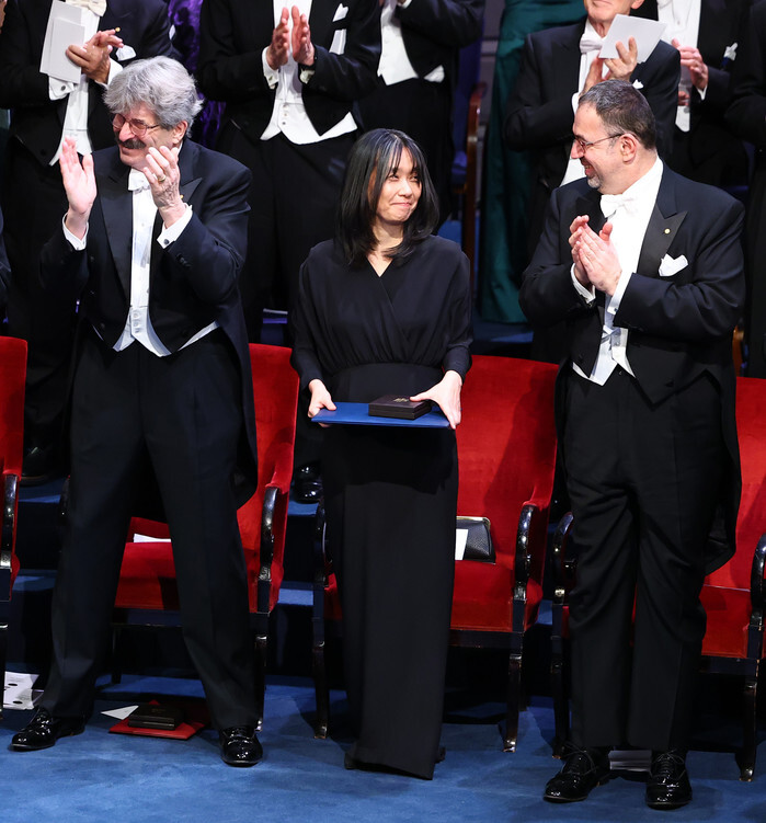 South Korean novelist Han Kang (C) is congratulated by other Nobel laureates after receiving a diploma and Nobel medal from Sweden's King Carl XVI Gustaf during the Nobel Prize 2024 award ceremony at the Concert Hall in Stockholm, Sweden, on Dec. 10, 2024. (Yonhap)