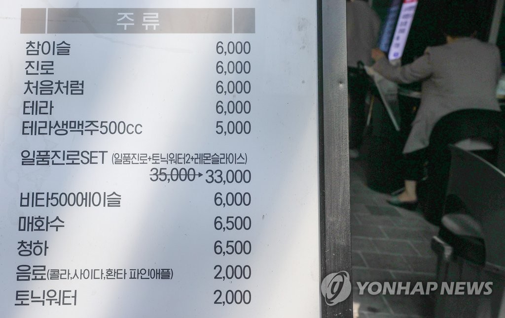 | ▲ 10% 넘게 뛴 외식용 소주·맥주 가격 (서울=연합뉴스) 신현우 기자 = 식당 등에서 마시는 외식용 소주·맥주 물가 상승률이 전체 소비자물가 상승률의 2배를 웃도는 가운데 3일 서울 시내 한 식당의 메뉴판. 통계청 소비자물가조사에 따르면 지난 2월 기준으로 외식용 맥주 물가 상승률은 10.5%로 IMF 외환위기 시기인 1998년 10월(10.8%) 이후 24년 4개월 만의 최고였다. 외식용 소주 물가 상승률도 11.2%로 2016년 11월(12.0%) 이후 6년 3개월 만에 가장 높았다. 모두 전체 소비자물가 상승률(4.8%)의 두배가 넘었다. 2023.4.3 nowwego@yna.co.kr |