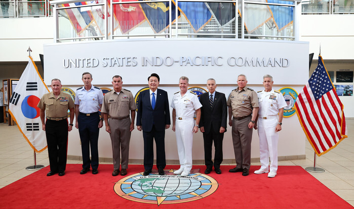 South Korean President Yoon Suk Yeol (4th from L) poses for a photo with U.S. commanders during his visit to Camp Smith, Indo-Pacific Command's headquarters in Hawaii, on July 9, 2024. (From L to R) Commander of the U.S. Marine Corps Forces Pacific William Jurney, Commander of Pacific Air Forces Kevin Schneider, Commander of U.S. Army Pacific Charles Flynn, Commander of Indo-Pacific Command Samuel Paparo, U.S. Ambassador to South Korea Philip Goldberg, Commander of U.S. Forces Korea Paul LaCamera and Commander of U.S. Pacific Fleet Stephen Koehler. (Yonhap)