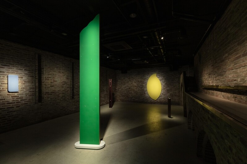김수근이 설계한 옛 공간 사옥에 자리 잡은 아라리오뮤지엄 전시장의 어둠에 눈이 익숙해지면 녹색 '빛의 산'이 먼저 눈에 들어온다. 3.3m 높이의 이 작품은 도시의 건물 사이로 슬쩍 보이는 산의 모습을 기하학적으로 형상화한 것이다. 그냥 녹색인 것만 같은 작품에 가까이 다가가면 미묘한 색과 질감이 느껴진다. 색을 칠하고 사포로 갈아내는 작업을 수없이 반복한 끝에 얻어진 색과 질감으로, 색을 여러 차례 쌓아 올리는 동양화의 채색 기법이 반영됐다.
