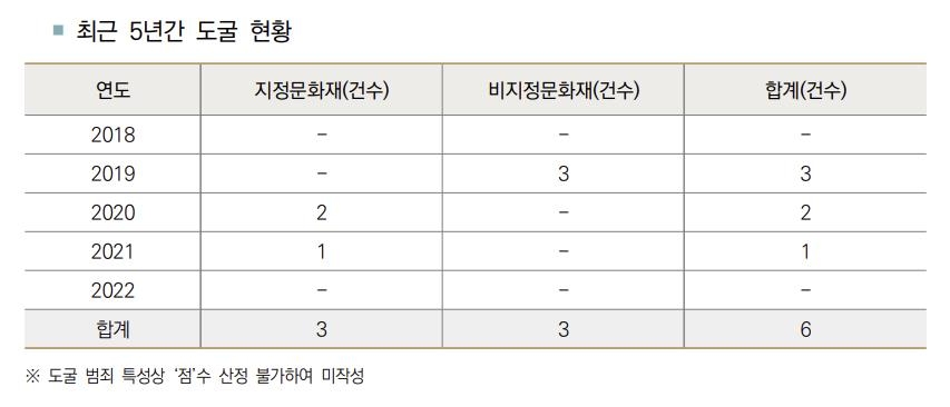 최근 5년간(2018∼2022) 상황을 보면 국가지정유산 3건, 비지정유산 3건 등 총 6건에서 도굴 범죄로 인한 피해가 있었던 것으로 집계됐다.