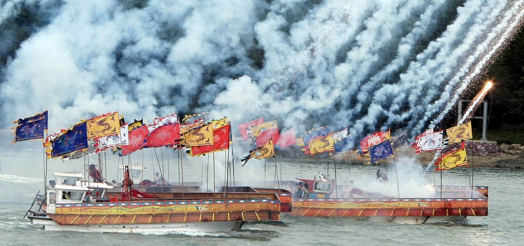 | ▲ 되살아난 명량해전 (해남=연합뉴스) 2014년 10월 11일 오후 전남 해남 우수영과 진도 사이의 해역인 울돌목에서 열린 '2014 명량대첩축제'에서 과거 판옥선처럼 꾸민 선박이 불꽃을 쏘며 명량해전 당시를 재연하고 있다. [연합뉴스 자료사진] |