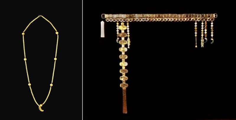 | ▲ 황남대총 남분 출토 유물 왼쪽부터 국보 '황남대총 남분 금목걸이', 보물 '황남대총 남분 금제 허리띠' [국가유산청 국가유산포털 제공. 재판매 및 DB 금지] |