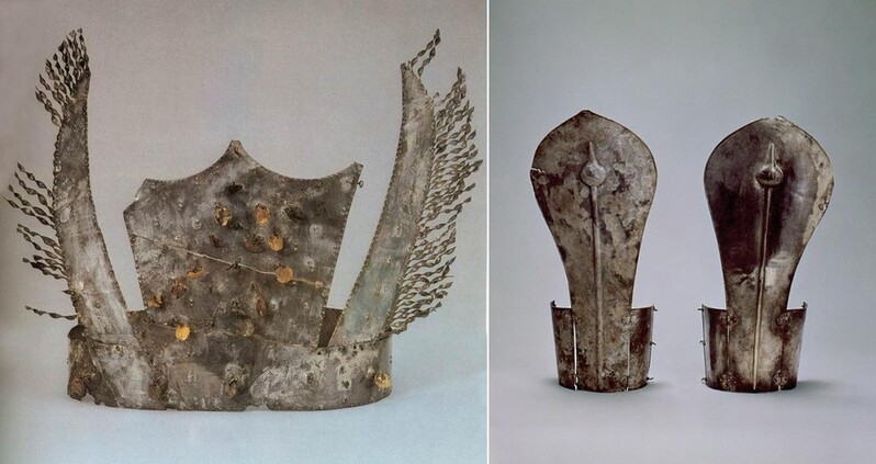 | ▲ 황남대총 남분 출토 유물 왼쪽부터 보물 '황남대총 남분 은관', '황남대총 남분 은제 팔뚝가리개' [국가유산청 국가유산포털 제공. 재판매 및 DB 금지] |