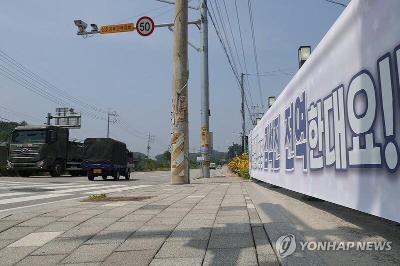 ▲ 신교대 앞에 걸린 BTS 진 전역 축하 메시지 (연천=연합뉴스) 임병식 기자 = 그룹 방탄소년단(BTS) 진의 전역을 앞둔 11일 경기도 연천군 육군 5사단 신병교육대대 앞에 진의 전역을 축하하는 플래카드가 걸려 있다. 2024.6.11 andphotodo@yna.co.kr