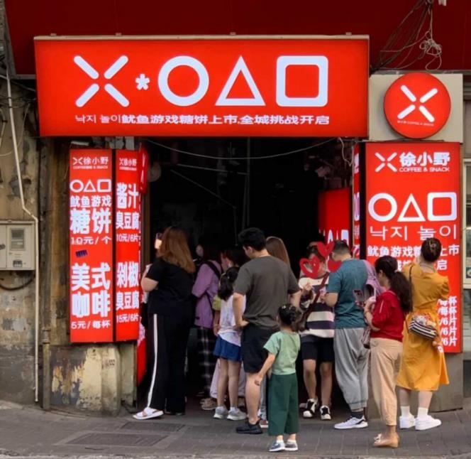 ▲ 중국 상하이에 고객들이 줄지어 선 달고나 가게 모습 '오징어 게임' 로고를 무단으로 사용하고 있다. [팔로워 제보 사진을 서경덕 교수가 제공]