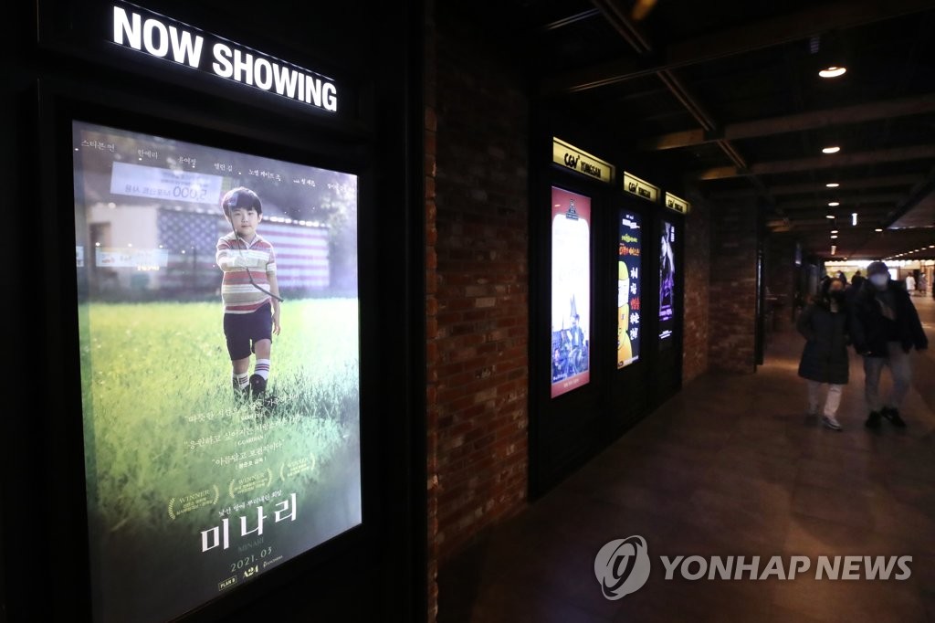 | ▲ 골든글로브 수상작 '미나리' 1위 질주 (서울=연합뉴스) 진연수 기자 = 7일 서울 시내 한 영화관에 영화 '미나리' 포스터가 걸려 있다. 영화진흥위원회 영화관 입장권 통합전산망 집계에 따르면 골든글로브 최우수외국어영화상을 수상한 영화 '미나리'는 지난 6일 하루 동안 8만7천975명의 관객을 동원하며 누적 관객수는 19만5천732명을 기록했다. 2021.3.7 jin90@yna.co.kr |