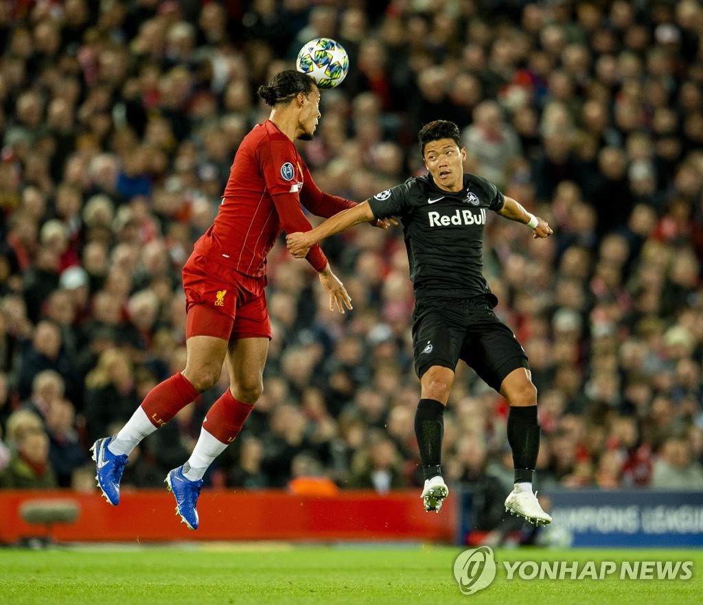 | ▲ 잘츠부르크 시절 판데이크와 공중볼 다투는 황희찬. [EPA=연합뉴스 자료사진] |