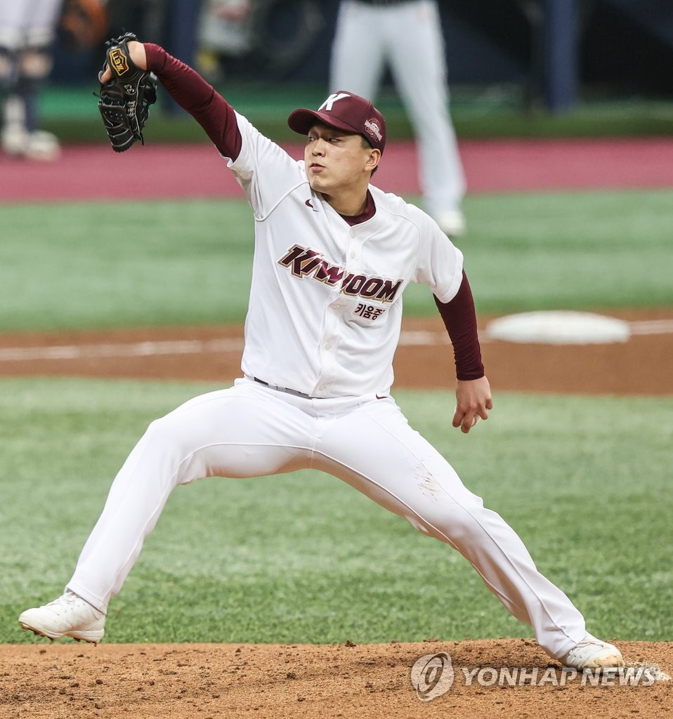 ▲ In this file photo from March 2, 2021, Kim Jeong-in of the Kiwoom Heroes pitches in an intrasquad game at Gocheok Sky Dome in Seoul. (Yonhap)