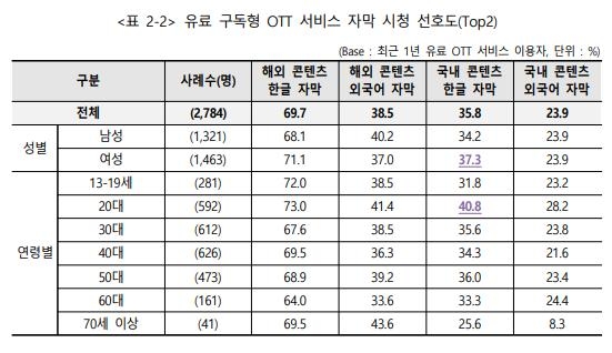 콘진원이 조사한 OTT 이용행태 조사에서도 국내 콘텐츠를 볼 때 한글 자막을 선호하지 않는다는 대답이 전체의 32%를 차지했다. 이는 선호한다는 답변과 불과 3.8%포인트 차이다.