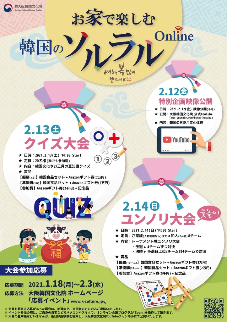 일본 오사카(大阪) 한국문화원(원장 정태구)은 12일 '한국의 설 문화체험'(www.youtube.com/bunkainosaka)이라는 영상을 상영하고, 다음날에는 가족이 집에서 즐길 수 있도록 온라인 퀴즈 대회, 14일 윷놀이 대회를 개최한다.