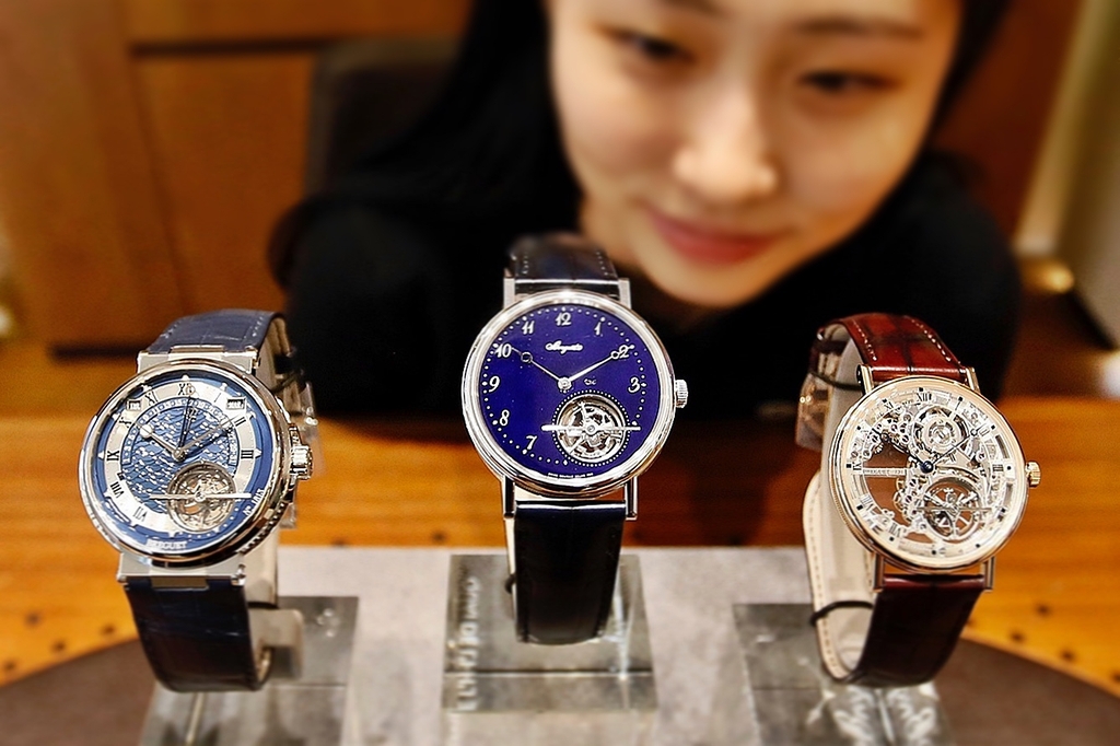 ▲ 갤러리아백화점은 스위스 명품 시계 브랜드 '브레게'(Breguet)의 '투르비용'(기계식 시계에서 중력으로 발생하는 시간 오차를 자동으로 보정해주는 장치) 발명 220주년을 맞아 31일까지 명품관 이스트 지하 1층 마스터피스존에서 투르비용이 탑재된 상품을 전시한다고 21일 밝혔다. 전시 상품은 투르비용 무브먼트의 두께가 3㎜도 안 되는 '클래식 투르비용 엑스트라-플랫 오토매틱 5367PT' 등 4점이며 이들 상품의 가격을 합하면 총 10억원에 이른다. (서울=연합뉴스)