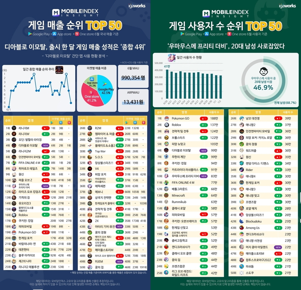 (서울=연합뉴스) 오규진 기자 = 지난달 출시된 게임 '디아블로 이모탈'과 '우마무스메 프리티 더비'가 게임 사용자 수(MAU)·매출 순위에서 나란히 상위권에 안착했다.