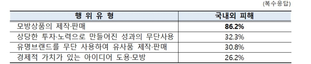 피해기업이 경험한 부정경쟁행위 유형(복수 응답)은 모방상품 제작·판매 행위가 86.2%로 가장 많았다.