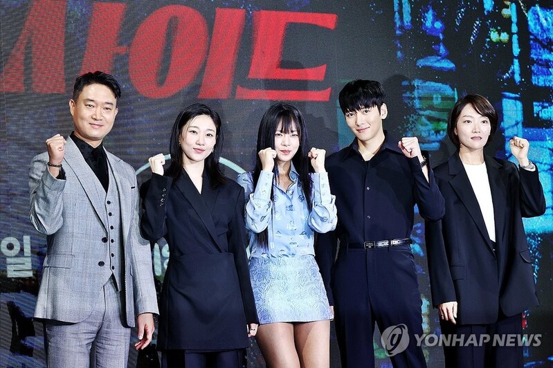 | ▲ 디즈니+ 오리지널 시리즈 '강남 비-사이드' 파이팅 (서울=연합뉴스) 진연수 기자 = 30일 서울 종로구 포시즌스 호텔에서 열린 디즈니+ 오리지널 시리즈 '강남 비-사이드' 제작발표회에서 감독과 배우들이 포즈를 취하고 있다. 왼쪽부터 배우 조우진, 하윤경, 김형서(비비), 지창욱, 방누리 감독. 2024.10.30 jin90@yna.co.kr |