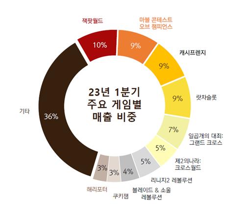 게임별 매출 비중은 '잭팟월드' 10%, '마블 콘테스트 오브 챔피언스' 9%, '캐시프렌지'·'랏차슬롯' 9%, '일곱개의 대죄: 그랜드 크로스' 7% 순이었다.