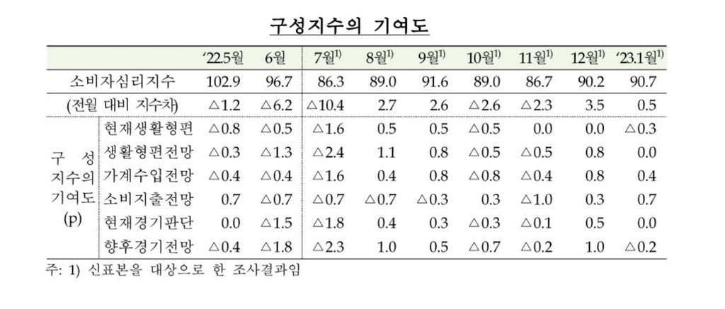 1월 전체 소비자심리지수(CCSI)는 90.7로, 12월(90.2)보다 0.5포인트 상승했다.