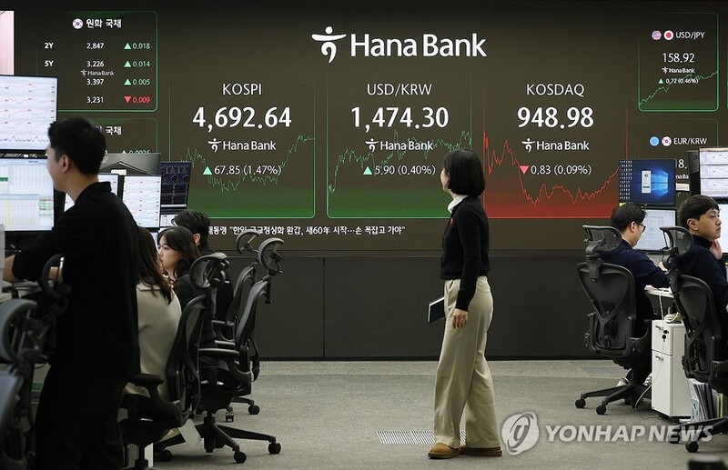 | ▲ This photo shows the dealing room of Hana Bank in Seoul on Jan. 13, 2026. (Yonhap) |