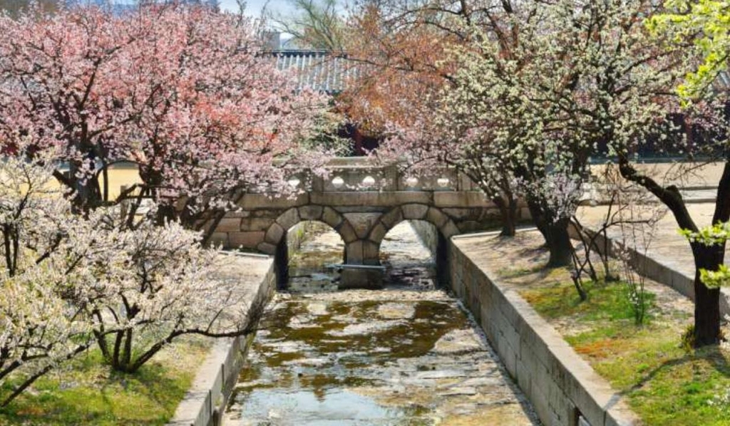 옥류천을 가로지르는 창경궁 옥천교 어구 일원에서는 살구나무가 인상적이다.