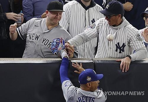 다저스 우익수인 베츠는 1회말 양키스 1번타자 글레이버 토레스가 날린 타구를 쫓아 우측 파울라인 밖의 관중석 펜스까지 뛰어올라 공을 잡았다.