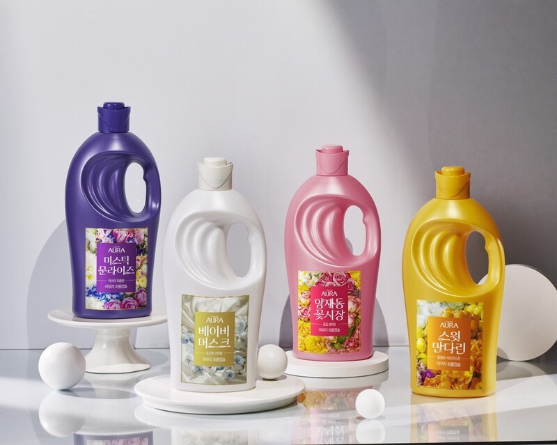 ▲ LG생활건강의 고급 섬유유연제 브랜드 아우라는 고농축 퍼퓸 캡슐 섬유유연제 4종(양재동꽃시장·스윗만다린·미스틱문라이즈·베이비머스크)을 출시했다. 일반 섬유유연제 대비 향기 성분이 3.3배 추가된 제품으로 사용 후 30일간 향이 지속된다.