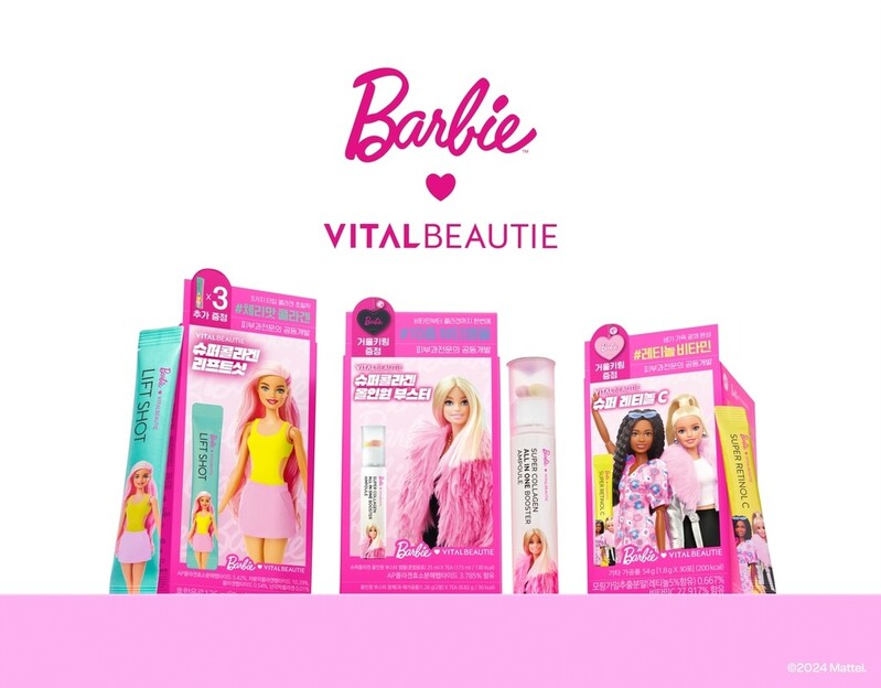 ▲ 아모레퍼시픽의 이너뷰티(Inner Beauty·먹는 화장품) 브랜드 바이탈뷰티는 해외 브랜드 '바비'와 협업한 제품을 출시했다. 슈퍼콜라겐 올인원 부스터와 슈퍼레티놀 C, 슈퍼콜라겐 리프트샷 3종으로 올리브영에서 한정 수량으로 만나볼 수 있다.